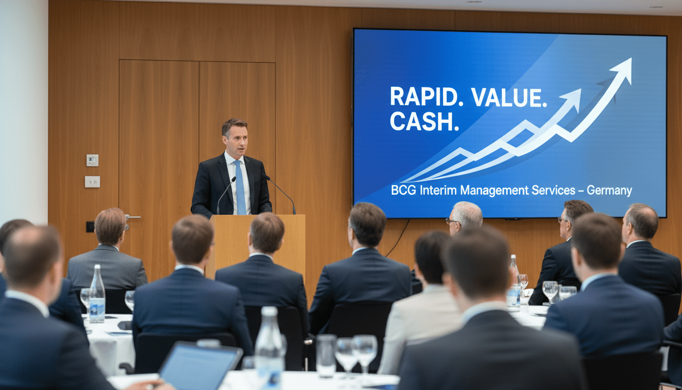BCG said it will roll out a new service called “Rapid Value and Cash” in Germany to place experienced interim leaders in tense or transitional corporate situations, marking the consultancy’s formal entry into the interim-management market. The initiative, which BCG described to journalists in Frankfurt, intends to assemble a vetted pool of roughly 100 senior executives who can step into board and CEO roles on short notice. The offering couples leadership placement with small teams that include artificial intelligence specialists, reflecting the firm’s strategy to deliver both operational control and rapid tech-enabled transformation.